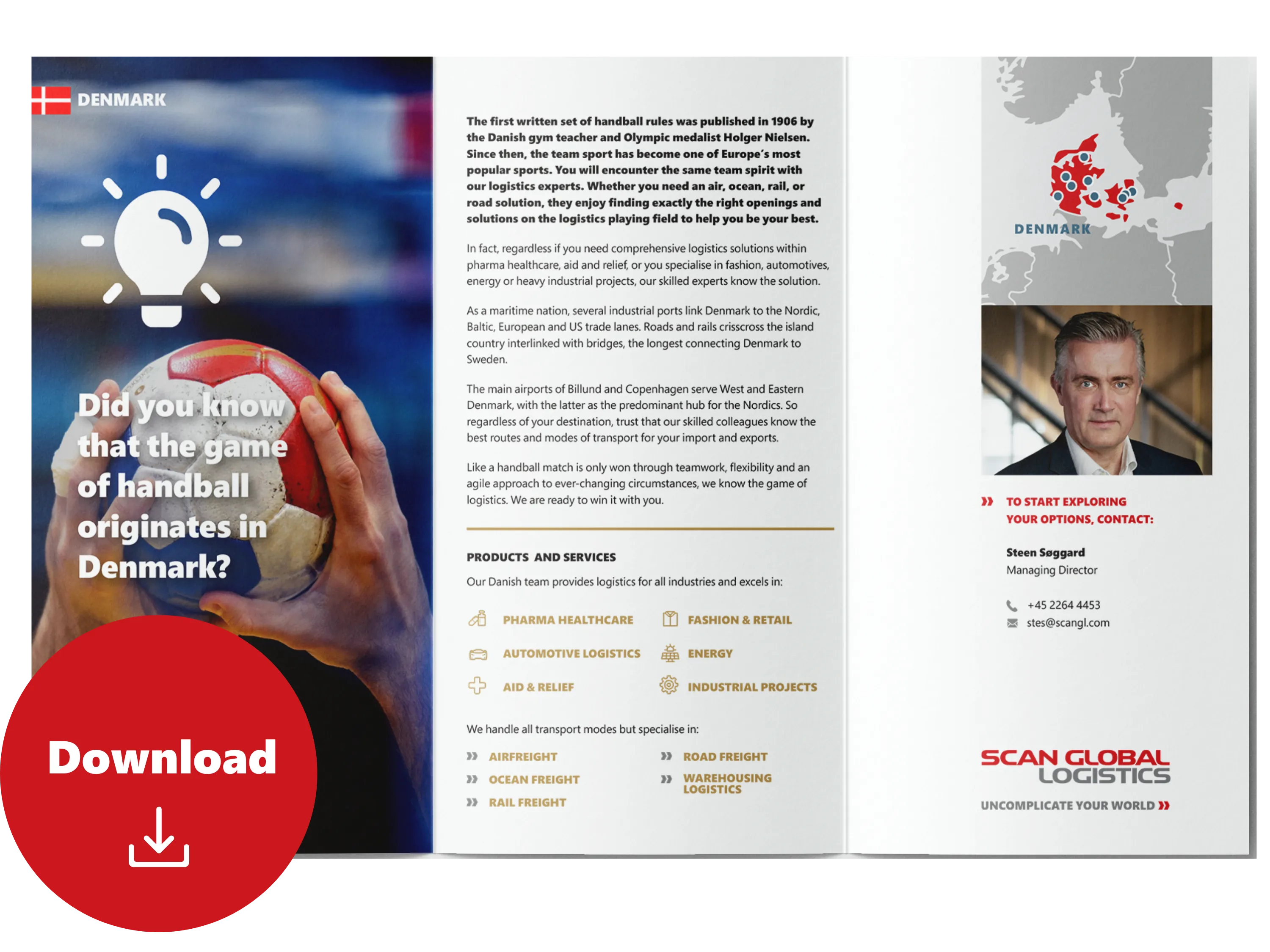 The first written set of handball rules was published in 1906 by the Danish gym teacher and Olympic medalist Holger Nielsen. Since then, the team sport has become one of Europe’s most popular sports. You will encounter the same team spirit with our logistics experts. Whether you need an air, ocean, rail, or road solution, they enjoy finding exactly the right openings and solutions on the logistics playing field to help you be your best.