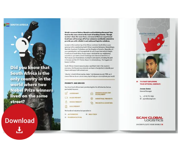 Located at the southern tip of the African continent, South Africa is the gateway to the neighbouring countries of Botswana, Mozambique, Namibia, Swaziland, Zimbabwe and the Kingdom of Lesotho. Regardless of your specialisation, we can handle international air and sea shipments in and out of South Africa. Whether your cargo is destined for our neighbouring countries or you require customs brokerage and clearance, leave it to us. We will ensure your final delivery to all ports and airports, including the Port of Durban and Johannesburg’s OR Tambo Airport, the largest and busiest in Africa.