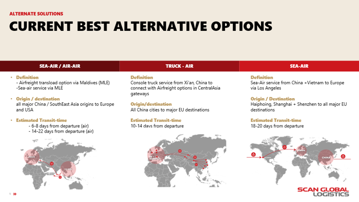 On the airfreight side, we have already seen a surge in requests for alternatives, namely Sea-Air and part & full charter options. Below you will find an overview of alternative routings across modes, and should you wish to explore these further, please reach out to your dedicated SGL contact person.