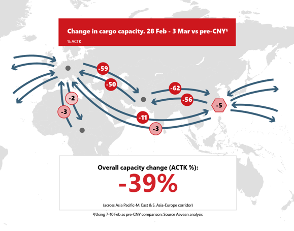 From a total capacity perspective on the blockbuster route from Asia to Europe estimates vary, however, consensus remains around the 35-40 % mark in terms of reduced capacity. Using representative pre-lunar new year levels as a baseline, consultancy Aevean, estimates that capacity across the Asia Pacific–Middle East and South Asia – Europe corridors is down by 39 % in available cargo tonne kilometres.