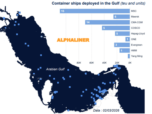 According to Alphaliner, nearly 140 container vessels are trapped inside the Middle East Gulf, with MSC and CMA CGM being the most affected carriers, with 15 (109.000 TEU) and 14 (70.000 TEU) vessels, respectively, seeking shelter.