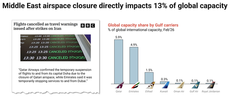 The disruption is accelerated by the critical role Gulf carriers play within global airfreight. Qatar Airways, Emirates Skycargo and Etihad together account for roughly 13 % of global air cargo capacity, and their hubs function as key East-West transfer points.