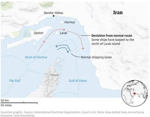 Iran has sought to redirect vessels from the main shipping lane through the strait to a “safe corridor” within its territorial waters. This route, which runs closer to the Iranian coastline, takes vessels between Larak Island and the mainland.
