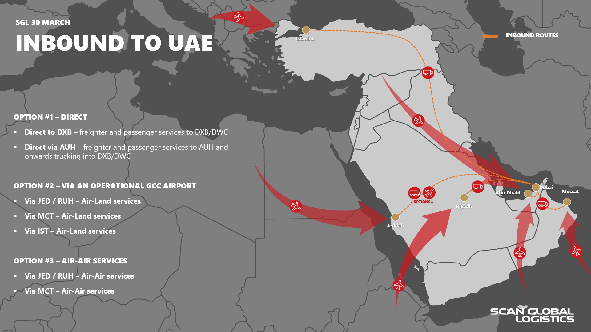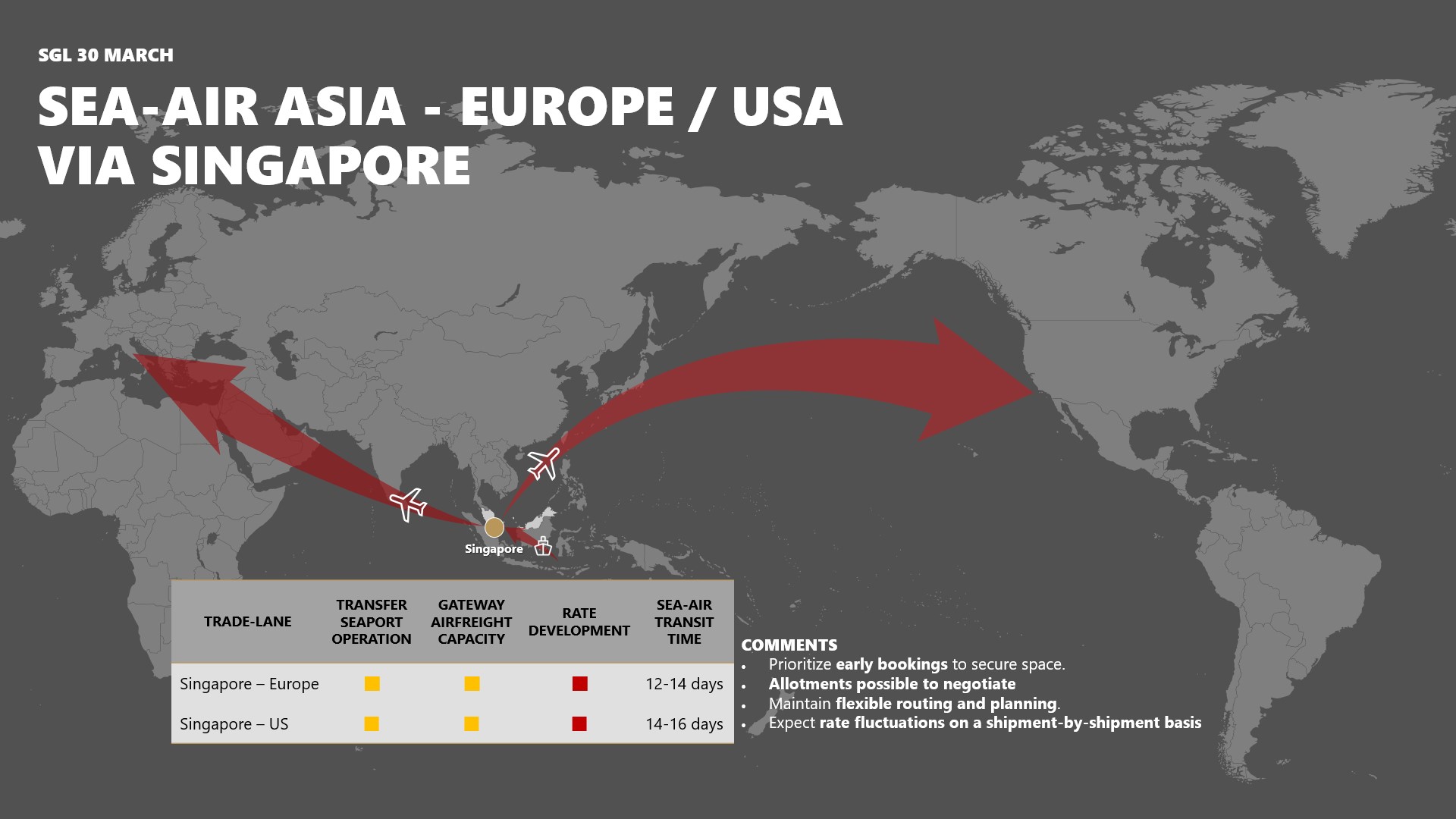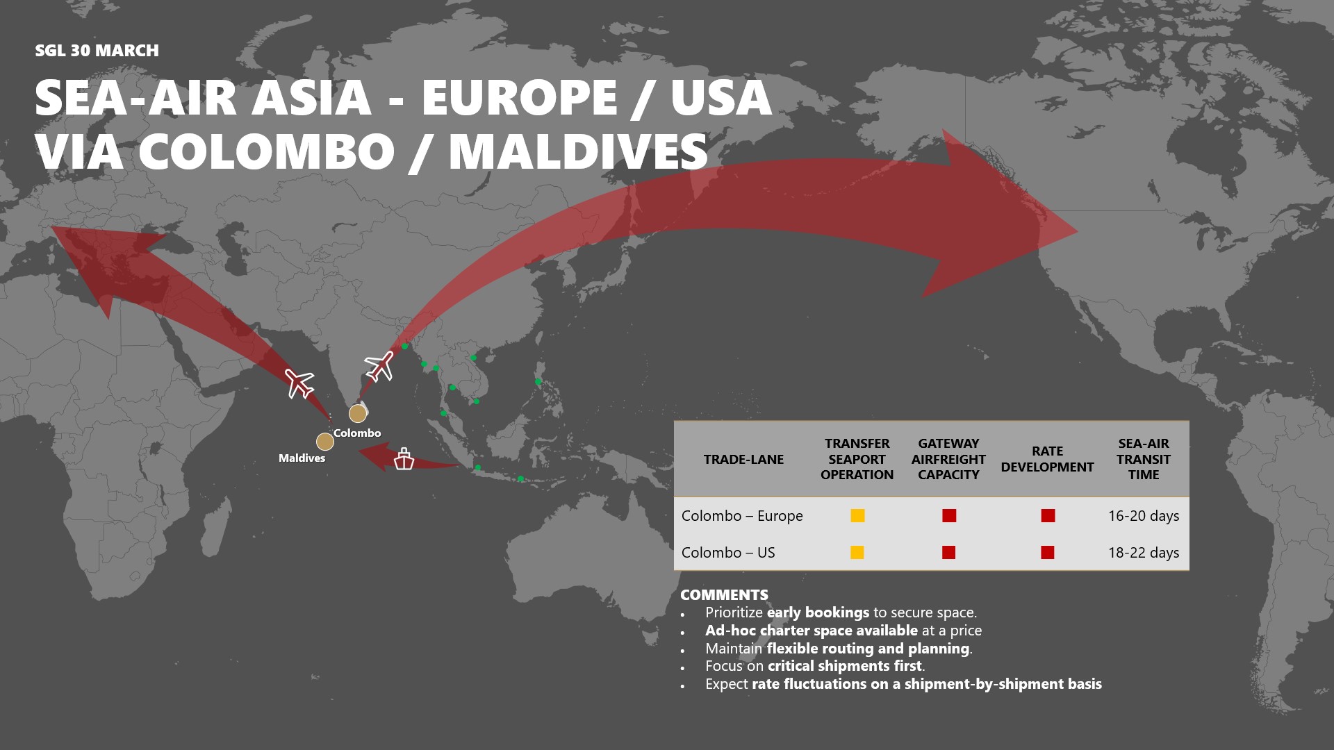 While available airfreight capacity continues to steadily increase with Middle Eastern Airlines having resumed both passenger and cargo flights, alternative shipment options remain critical. This is the case for both airfreight and ocean freight, where we now have a clear overview in place of all alternative routings and associated transit times.