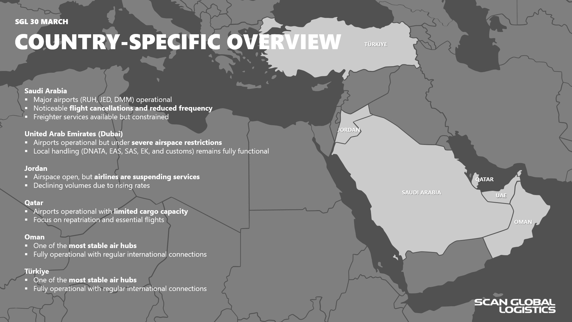 As the Middle East's geopolitical landscape continues to evolve, airfreight operations continue to face a multitude of impacting factors in the form of airspace restrictions, rerouted flights, and surging fuel costs, just to name a few. As shippers across the globe have also experienced in recent weeks, the situation, in addition to operational disruption, also comes along with a hefty price tag in the form of sharp rate increases and, not least, emergency fuel surcharges. Here’s the latest update on the situation and its impact on the global airfreight market.